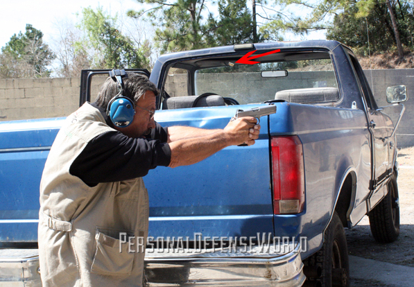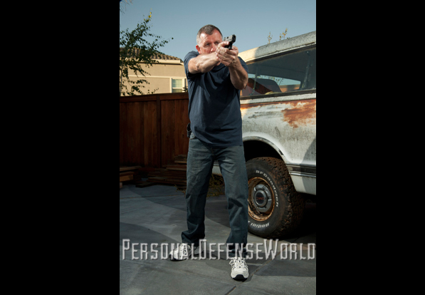 From here, if there’s time, the gun arm thrusts straight forward toward the threat, bringing the weapon up into your field of view, whether you plan on coarse aim or a precise sight picture. As the handgun is extending forward, the support hand comes in from behind the muzzle and completes the two-hand grasp.