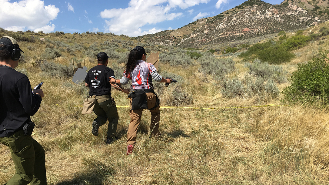 But finally, she was ready. She stood behind me with her rifle slung across her chest. The buzzer went off, and like a mad man I started moving down the creek bed, scanning left and right. As targets appeared, I raised my pistol, got on target, pulled the trigger. A mixture of steel and cardboard targets were placed at random, some causing me to think while others got a reactionary shot. This continued for approximately 50 yards. If you ask Rei, she would tell you a mile. (In defense, the density altitude was upwards of 8,000 feet.) Upon reaching the end of the pistol zone, I cleared my gun and reholstered it.