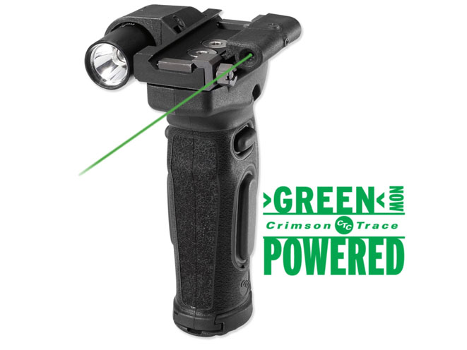 For long guns with rails, such as the popular AR/MSR rifles, Crimson Trace also produces the Modular Vertical Foregrip® with red and green laser versions available. These MVF Foregrips provide 200 lumens of bright white LED and can be cycled through three light modes, including strobe and constant on. For proper attachment, these units require at least 4 inches of accessory rail. Easy-to-operate side buttons on the unit are the operation controls.