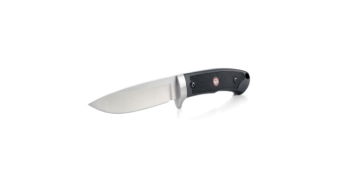 RMJ Tactical Designed: Fixed-blade survival knife – featuring a black, stonewashed 4.75″ plain blade; rubber, overmold, full-tang handle with inset Ruger medallion; and leather sheath.