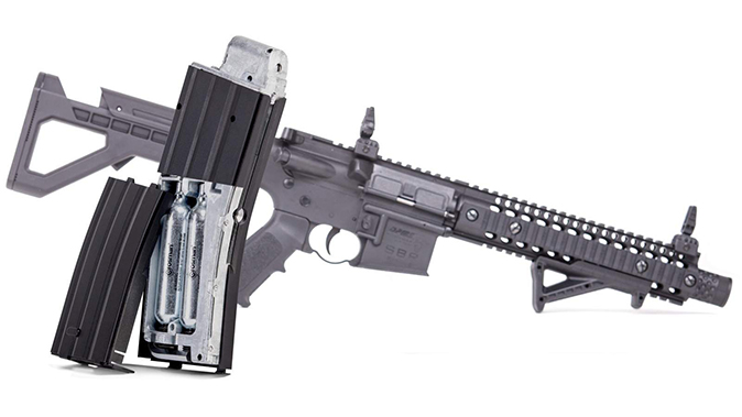 According to the press release, the compact DPMS SBR sends out steel .177 BBs in either semi-auto mode or full-auto mode, with a rate of fire of 1400 rounds per minute and a maximum velocity of 430 fps. The rifle is based on the DPMS PDW short-barreled rifle. It features a 6-position buttstock, AR compatible pistol grip, quad Picatinny rails for attaching accessories, angled fore grip and flip up iron sights. It’s powered by two 12-gram CO2 cartridges housed in a 30rd magazine.