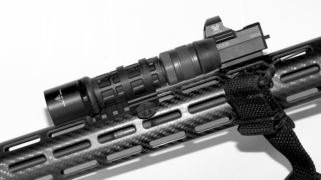While the Vortex Razor red dot worked fine at the end of the handguard, I repositioned it closer to the receiver and mounted a Magpul M-LOK rail just to the left and down from it. There I attached a 1-inch-adjustable ring to hold a SureFire G2 light with the pressure switch in line with my left thumb.