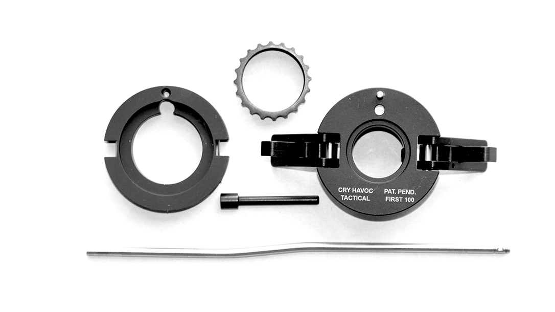 The system utilizes front and rear hardcoat anodized 6061-T6 aluminum plates. The rear plate, called the “receiver plate assembly,” is secured to the upper receiver by the special QRB nut. Cry Havoc Tactical calls this the barrel nut, but it only locks the rear plate to the receiver with the modified gas tube extension locked behind it. The tube extension will mate tightly with the shortened gas tube when assembled.
