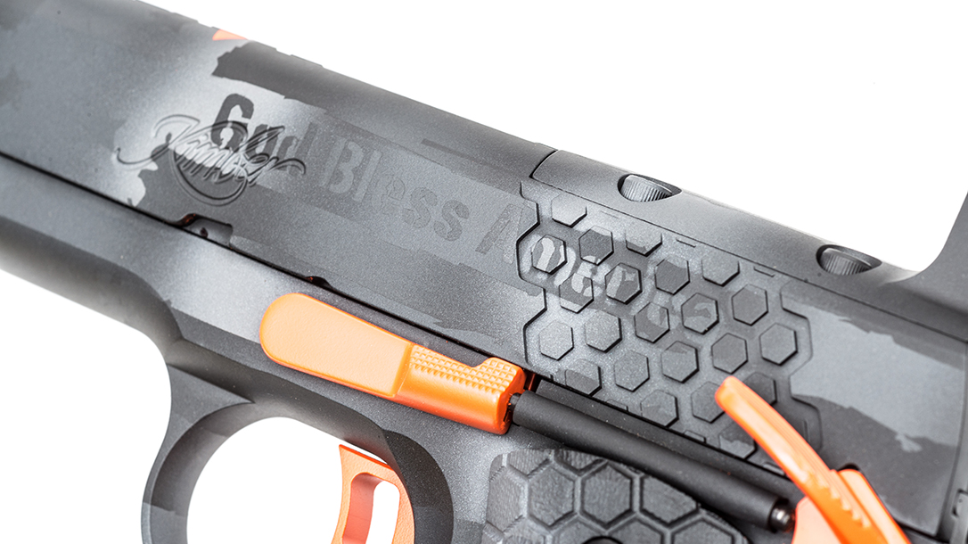 Each KHX pistol from Kimber features “stiplex” frontstrap texturing, slick Ballistic-esque hexagonal slide serrations at the rear that match those on top, a round-heel frame and Hogue Enhanced G10 grip panels.