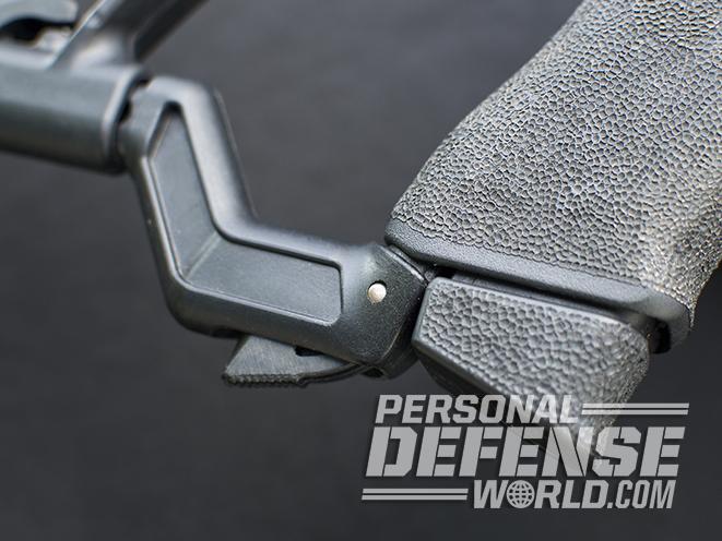 Another point to consider is the Glock’s lack of an external safety. Typically, a holster will offer an additional layer of safety for your Glock. However, a holster isn’t really feasible for a Glock equipped with the FAB Defense FGGK-S. Logic dictates that such a holster would be too big and just impractical—“tacti-cool” but “impracti-cool.” Fortunately, the FGGK-S foregrip swings up and extends to the rear, creating a safety cap over the triggerguard.