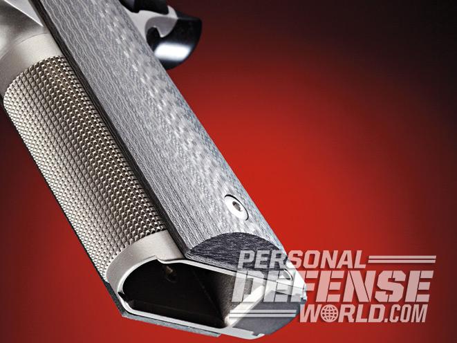 The slide stop on the full-sized gun is slightly extended, allowing you greater leverage when disengaging the slide. Besides looking sharp, the cocking serrations on the Damascus slide provide a positive grip.