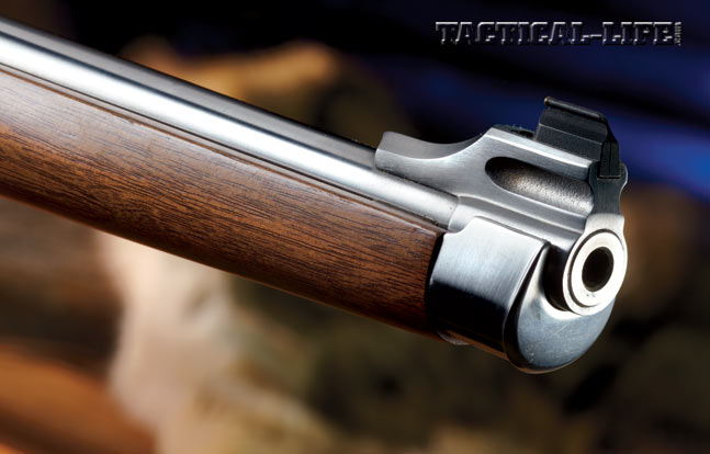 The steel nose cap on the full-stocked M77 RSI rifle is one of the accuracy-robbing culprits. Also note the large, easy-to-see front sight.