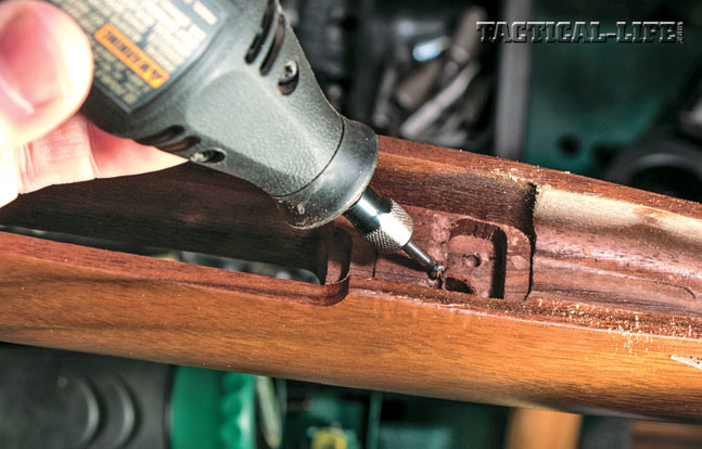 First, I relieved the stock all along the barrel, from the action to the end of the forend. Then I also relieved some wood around where the recoil lug fits into the stock and at the very tip where the barrel band matches up with the stock. Using Brownells Acraglas, both of these points were lightly bedded. This helped lock the barreled action into the stock, but I also needed to correct the issue with the nose cap pushing against the barrel band. To do this I took a flat file and worked the inside of the nose cap at the tips until there was a gap between it and the barrel band. Now, when assembled, there’s no contact between the nose cap and the barrel.