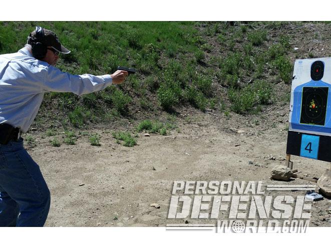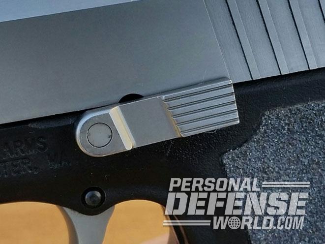 Again, I laud the improved sight picture and trigger action, which felt smoother and lighter, breaking clean with no overtravel, and this time my thumb didn’t hit the slide stop. In fact, the beveled slide stop had no sharp corners to catch the thumb, holster or clothing. Mags dropped free and the rather snappy recoil in rapid fire was easily controlled by the stippled grip.
