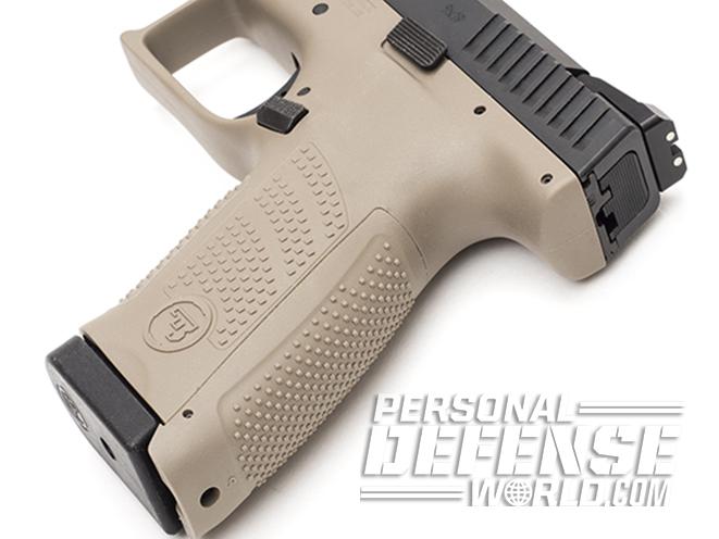 The specs from the factory state that there are three interchangeable backstraps, including the one on the pistol, though the sample I received only had two. All that’s required to change out the backstraps is a punch to drive the pin out and slide the part off. Finally, the bottom of the grip (where it meets the floorplate of the magazine) has concave dips in the frame so the user can get a purchase on the magazine if it’s too dirty to drop freely from the pistol.
