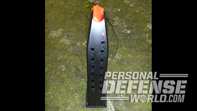 Finally, the steel magazine also fits the CZ P-07 series pistols. It has an orange high-visibility follower as well as a thicker baseplate to help seat it fully during rapid reloads.