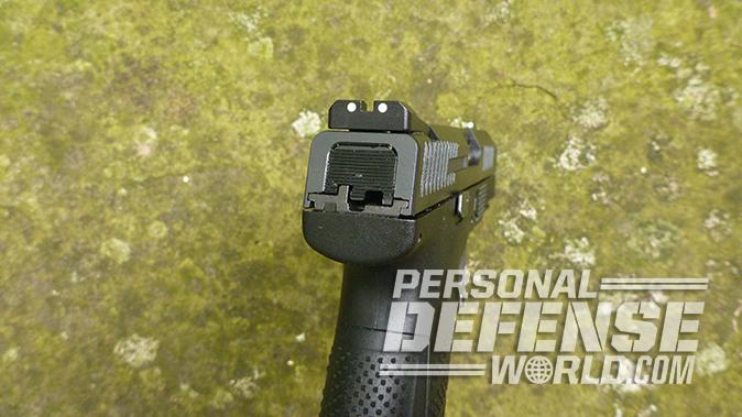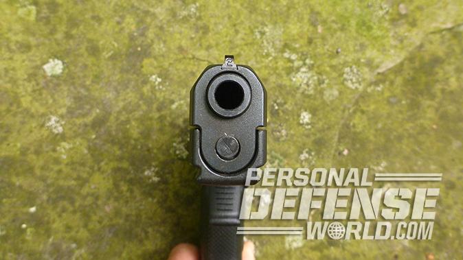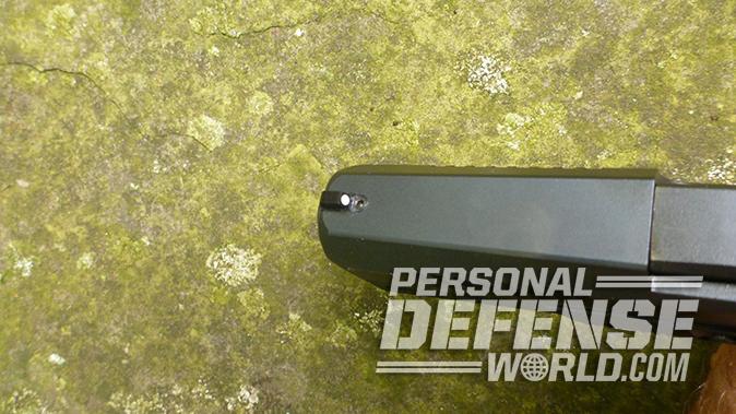 The slide is milled from a single billet of steel. Its top edges are beveled to reduce bulk and weight, with front and rear serrations. The slide rides on rails that are integral to a front and rear insert rather than being molded into the frame like the Glock, making repairs easier because you don’t have to replace the entire frame, which is the serialized part.
