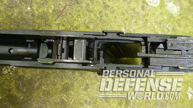 A thick plastic recoil spring guide and flat spring are used. The internal parts of the P-10 C appear to be robustly designed, with dual steel trigger bars and dual trigger bar springs rather than a single one, as with the G19. The steel magazine release is durable, as is the barrel, which has a very wide locking lug that engages the front frame insert. The barrel is cold-hammer forged, which makes for a stronger and longer-lasting barrel than those that are broach-cut from bar stock.
