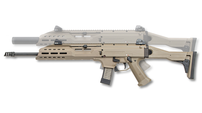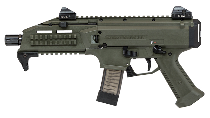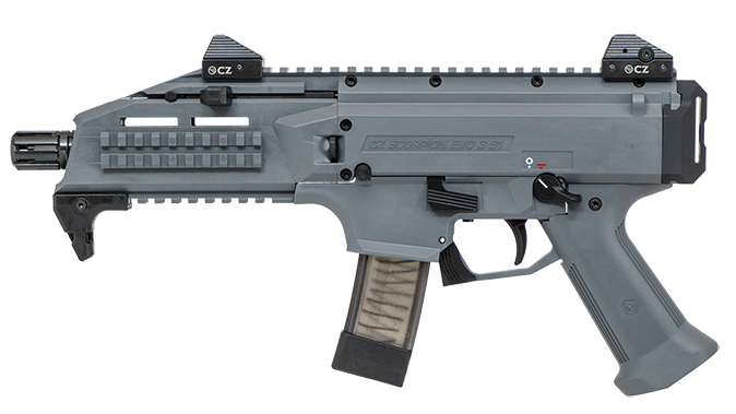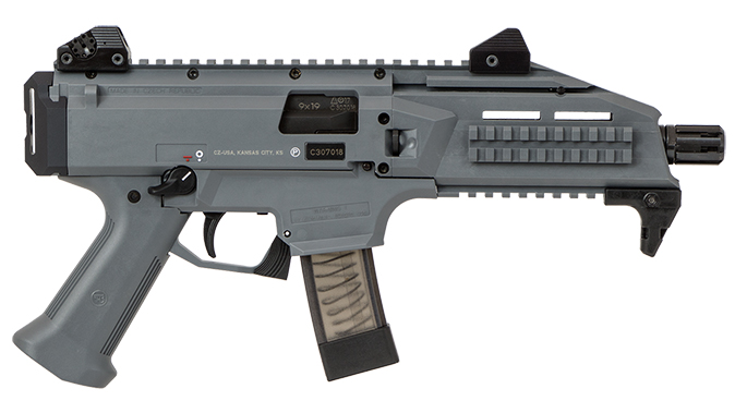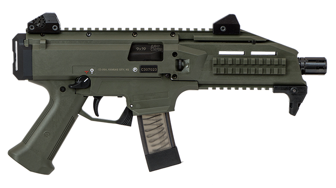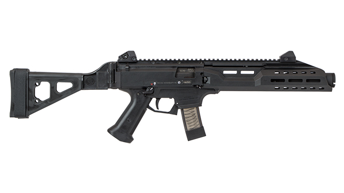 Next is the 9mm Scorpion EVO 3 S1 Pistol with a flash can and a SB Tactical folding arm brace. Designed for those of you wanting a complete braced pistol package right out of the gate, this model features an extended carbine handguard and, as the name would indicate, a flash can muzzle device. Boasting a 7.7-inch barrel, owners can unscrew the five-inch KAK flash can and install most pistol suppressors under the handguard, keeping the OAL down. Dual threads of 18×1 and 1/2×28 make it easy to fit a suppressor, CZ says. MSRP: $999.