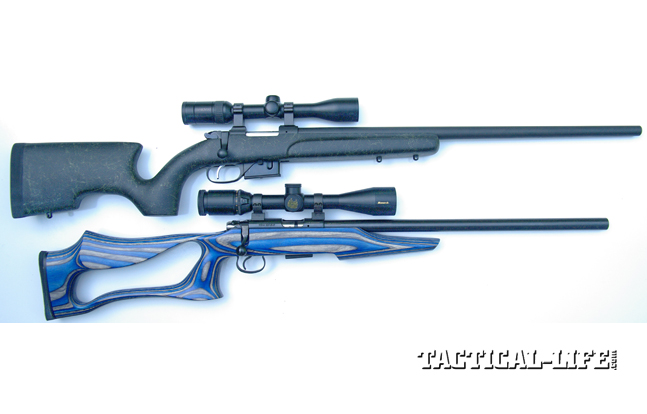 What sets the 455 action apart from most bolt-action rimfire rifles is that it offers barrel/caliber interchangeability. The Varmint Evolution will accept user-interchangeable barrels in .22 LR, .22 WMR and .17 HMR—just like any in the 455 line. The shank portion of the barrel, which is 1.2 inches long, slip-fits into the receiver, where it’s locked in place with two rearward-angled Allen-head screws. These screws bear against similarly angled flats on the barrel shank. Switching barrels, of course, has been made idiot-proof, as the barrel cannot be fully seated and locked unless a flat surface on the breech, just below the chamber, is aligned with a matching flat in the receiver ring. It takes but a minute to change barrels, and when changing from .22 LR to either .22 WMR or .17 HMR, the only other change required is to remove a plastic baffle in the magazine well to accommodate the longer magazine, which of course is furnished when you purchase the accessory barrel. My test rifle was chambered in .22 LR, but I also requested the .17 HMR barrel to check out the caliber-swap aspect.
