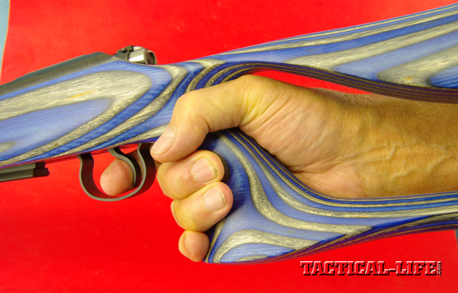What’s distinctive about this particular model is its Kevlar stock. Like any good varmint/target handle, it has a wide, flat forend measuring 2.35 inches across for extra stability when shooting off sandbags. The cutaway behind the grip looks kind of silly, but it’s really quite functional. Any time you’re shooting off sandbags, the normal position for the left hand is behind the grip, where you can squeeze or slide the rear sandbag fore and aft to affect subtle changes in elevation.