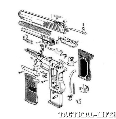 The vzor 52 is one of the easiest pistols to field strip that I have come across. Just remove the magazine and retract the slide to verify the chamber is empty. While holding the pistol by the top of the slide, pull down the two grooved catches on either side of the triggerguard, move the slide slightly forward and lift it off the frame. To remove the barrel and recoil spring, insert a Phillips-head screwdriver or punch into the round hole on the bottom of the breech unit and pull the barrel unit forward until the breech end clears the slide rails. Then, tip the rear of the barrel up and remove it rearward. A word of warning: At this point, the recoil spring is compressed so be sure to restrain it. Use the lip of the magazine baseplate to remove the spring clip holding the grip panels in place. Reassemble in reverse order. Note that, once the slide/barrel unit is reassembled, you just need to line up the front slide rails with the notches on the front of the frame and snap the slide back down onto the frame.