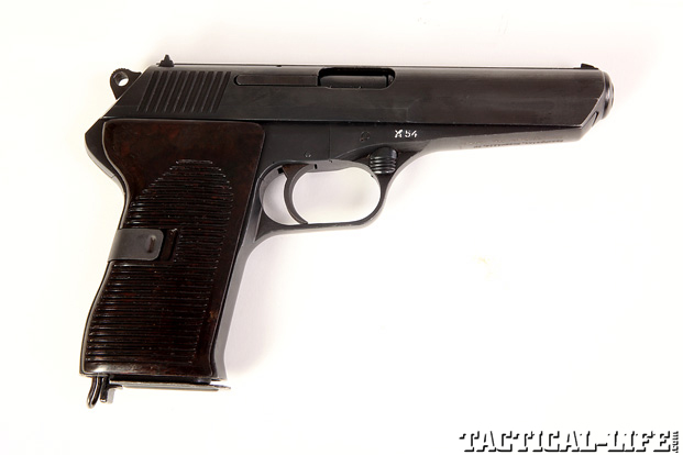The vzor 52’s sights consisted of a low blade front and a U-shaped notch rear. The magazine was retained by a typical European-style, heel-type catch, and all pistols were equipped with a lanyard ring directly behind the magazine catch. All vzor 52s were finished with a gray phosphate finish and dark brown plastic grips held in place by a large spring clip. Pistols were issued with a brown or natural colored leather holster, a spare magazine, a cleaning rod and a lanyard.