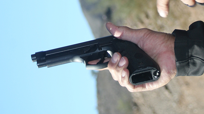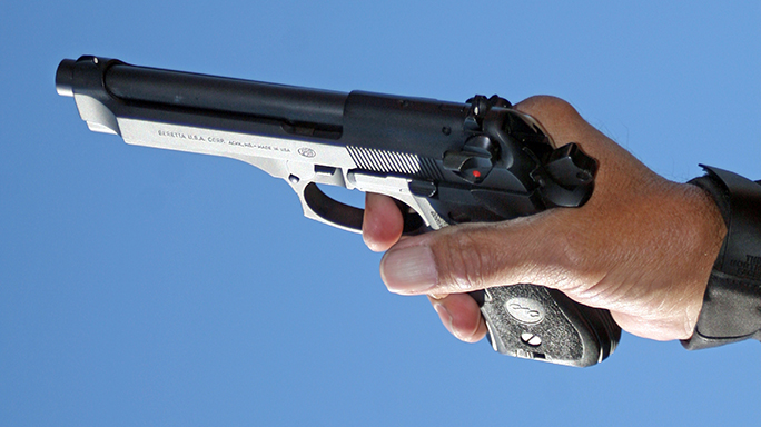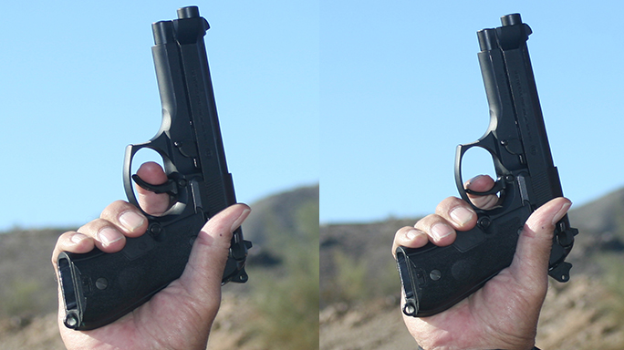 If you have a Beretta, Walther, etc., with the safety/decocking lever on the slide, I would most strongly urge you to manipulate the slide with the Israeli method, in which the support hand comes over the slide as if manipulating a slingshot, with the thumb forward. This will maintain the lever in the position it was in when you began the movement. Using the American technique of the support hand atop the slide with the thumb pointed toward the shooter, developed for Colt pistols that didn’t have slide-mounted levers, the thumb will often unintentionally put the gun on “safe.”