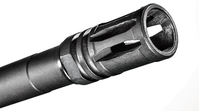 The DTI .308 is a semi-automatic, carbine-length rifle that uses the direct gas impingement operating system. The 16-inch, chrome-moly-vanadium barrel features a heavy profile and a 1-in-10-inch twist rate to handle a wide variety of bullet weights. As a carbine, the rifle also has a carbine-length gas system. The muzzle is threaded and topped with an A2-style flash suppressor that can be removed and replaced with a different-style muzzle device or a direct-thread suppressor.