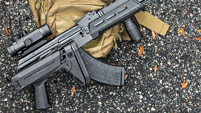 Cryptic nomenclature aside, these rifles are excellent examples of what a builder can achieve when not concerned with purists. Instead of installing a prohibitively expensive rear trunnion designed for either Soviet or Bulgarian side-folding stocks, DDI chose Magpul’s new Zhukov-S stock for this model. It has the same side-folding functionality of its mil-spec cousins at less than half the price. Though the Zhukov-S has more than just economic advantages over mil-spec offerings, it also carries practical and ergonomic benefits as well.