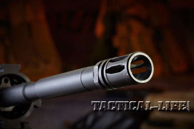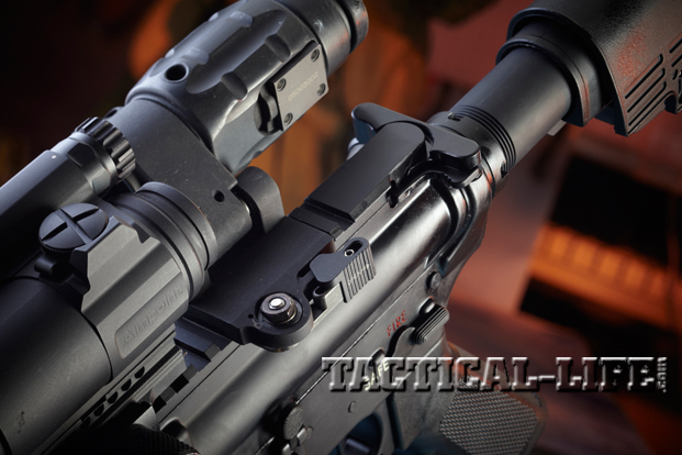 The receiver is mated to a one-piece, black anodized aluminum handguard that has a Picatinny rail running along its top, making it possible to mount optics or accessories like a laser—for those agencies that use them—or a front sight. The handguard is ventilated to help cool the barrel and is comfortable to handle because it does not have rails running along its sides or bottom. However, at the front of the handguard, at the 3, 6 and 9 o’clock positions are 2-inch rails onto which may be mounted accessories like a foregrip, a bipod or a light—which is often a requirement for law enforcement.
