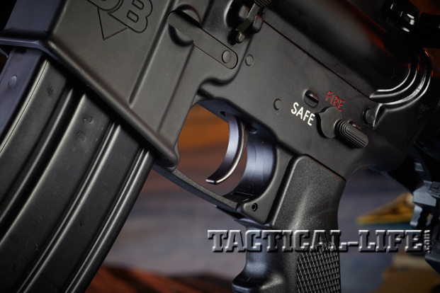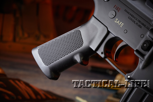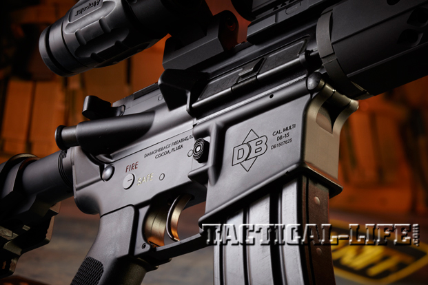 There will be no mistaking the “safe” and “fire” positions on the DB15 because the lower receiver is marked in big red letters on both sides with the word “fire.” Safe is likewise marked, but in white letters. The Diamondback logo is positioned on each side of the magazine well, and the right side is marked indicating the lower receiver works with multiple calibers. The magazine well is nicely beveled to aid in speedy reloads, while the magazine release is a standard AR-style that, when pressed, allows magazines to fall freely away. Cops can find themselves in a situation where a fast reload is required, and the DB15 is set up for that contingency.