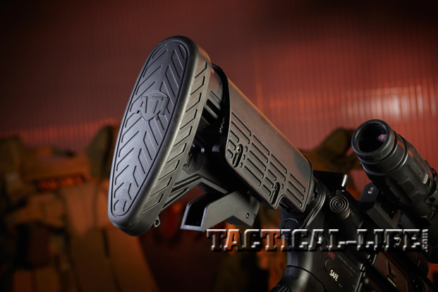 Fitted to the receiver extension of my test sample is an ATI buttstock. The buttstock latch spring is fairly light, making it easy to depress, so care must be taken not to accidentally do so, especially if using a bag to rest the buttstock on when shooting from a supported prone or benched position. An adjustable saddle attached to the top of the buttstock may be raised or lowered to align the shooter’s eye directly behind the sighting system. This could be helpful if an optic were mounted high because of a large-diameter objective lens. However, if the buttstock is not extended far enough to the rear, the charging handle cannot be fully retracted because the saddle interferes with it. If you like the saddle, leave it there. If you don’t, take it off.