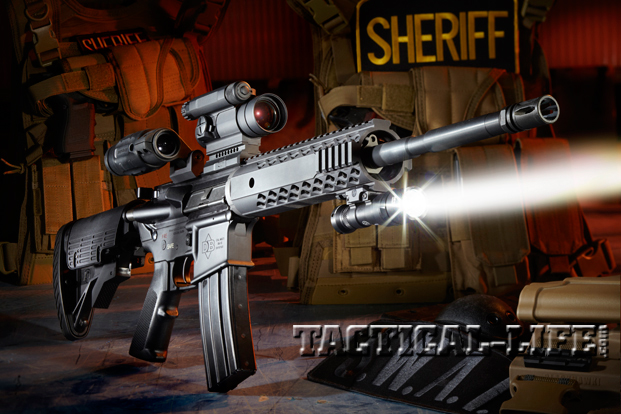 The receiver is mated to a one-piece, black anodized aluminum handguard that has a Picatinny rail running along its top, making it possible to mount optics or accessories like a laser—for those agencies that use them—or a front sight. The handguard is ventilated to help cool the barrel and is comfortable to handle because it does not have rails running along its sides or bottom. However, at the front of the handguard, at the 3, 6 and 9 o’clock positions are 2-inch rails onto which may be mounted accessories like a foregrip, a bipod or a light—which is often a requirement for law enforcement.