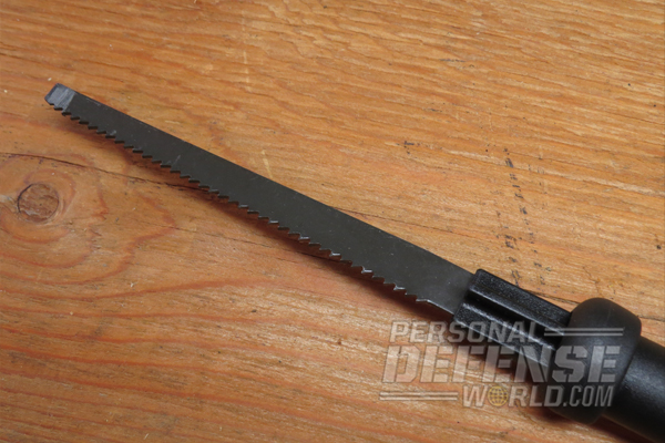 There’s even a saw inside the Glock E-Tool’s handle in case you need to work your way through some really nasty roots or saw up some poles for your shelter. The tip of the saw blade is cut to act as a large flat-head screwdriver as well. The Glock E-Tool comes with a simple but sturdy nylon carrier. The carrier uses a Velcro closure and has a somewhat odd strap arrangement on the back, which I presume works with Austrian military web gear or packs. It has a belt loop, though, and two metal rectangular loops that you could run straps through, or maybe even MOLLE connectors through. Or you could just stuff it in your pack or trunk.