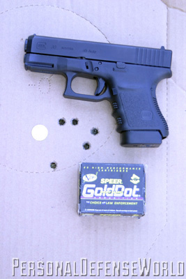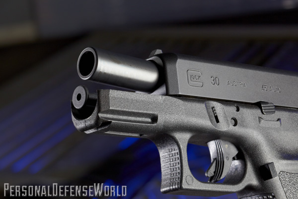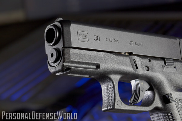 Glock introduced its first compact versions of the large-frame guns in 1997. The Glock 29 and the Glock 30 were the G20 and G21 “chopped and channeled” at the muzzle and butt. I got my hands on my first G30 in late March or early April 1997 and absolutely bonded with it. Though my eyes and the measuring tape didn’t reveal any discernible difference between the full-size G21 (13-round mag and 4.61-inch barrel) and the G30 (10-round mag and 3.78-inch barrel) in terms of reach to the trigger, the smaller G30 just fit my hand a lot better than the larger G21. I also noted that the G30 shot just a bit tighter. My test of the G21 had shown that it would shoot 1.5-inch groups, or a tad better, with five shots from a benchrest at 25 yards. But my shorter-barrel, early-production G30 twice gave me groups measuring under an inch—yup, five shots that measured 0.87 inches at their greatest distance from each other., once with 230-grain Federal Hydra-Shok and once with Remington 185-grain mid-range Match ammunition. It turned out that I couldn’t repeat it on demand, but that didn’t mean that the gun couldn’t. I was impressed with how soft the G30’s recoil was for a .45, even with +P loads. I found it reliable, too. Aluminum-case Blazer ammo of that period caused some problems feeding in Glock .45s, and I didn’t trust it then, although that problem seems to have gone away over the years. The G30’s necessarily strong, double captive recoil spring didn’t like super-light loads either—I had to hand-cycle those “softball” Remington semi-wadcutters. The 30 series was simply designed as combat guns and intended for combat loads. With those, the G30 was uber reliable. To make a long story short, the G30 quickly became my favorite Glock. My test sample never went back—I sent a check to Glock and bought the darn thing. It was to be the first of a series of compact Glocks in .45 ACP. Here we focus on one member of that family, the Glock 30SF.