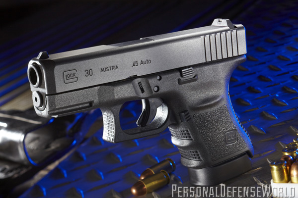 Glock introduced its first compact versions of the large-frame guns in 1997. The Glock 29 and the Glock 30 were the G20 and G21 “chopped and channeled” at the muzzle and butt. I got my hands on my first G30 in late March or early April 1997 and absolutely bonded with it. Though my eyes and the measuring tape didn’t reveal any discernible difference between the full-size G21 (13-round mag and 4.61-inch barrel) and the G30 (10-round mag and 3.78-inch barrel) in terms of reach to the trigger, the smaller G30 just fit my hand a lot better than the larger G21. I also noted that the G30 shot just a bit tighter. My test of the G21 had shown that it would shoot 1.5-inch groups, or a tad better, with five shots from a benchrest at 25 yards. But my shorter-barrel, early-production G30 twice gave me groups measuring under an inch—yup, five shots that measured 0.87 inches at their greatest distance from each other., once with 230-grain Federal Hydra-Shok and once with Remington 185-grain mid-range Match ammunition. It turned out that I couldn’t repeat it on demand, but that didn’t mean that the gun couldn’t. I was impressed with how soft the G30’s recoil was for a .45, even with +P loads. I found it reliable, too. Aluminum-case Blazer ammo of that period caused some problems feeding in Glock .45s, and I didn’t trust it then, although that problem seems to have gone away over the years. The G30’s necessarily strong, double captive recoil spring didn’t like super-light loads either—I had to hand-cycle those “softball” Remington semi-wadcutters. The 30 series was simply designed as combat guns and intended for combat loads. With those, the G30 was uber reliable. To make a long story short, the G30 quickly became my favorite Glock. My test sample never went back—I sent a check to Glock and bought the darn thing. It was to be the first of a series of compact Glocks in .45 ACP. Here we focus on one member of that family, the Glock 30SF.