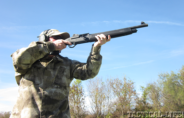Jordan writes, “The 1301 Tactical has a short 18-inch barrel, a fixed choke and ghost ring sights. I looked closely and found a few improvements from the old TX4. The 1301 Tactical has aggressive stippling in the stock and forend to help with handling under stress, when your hands are sweaty, bloody or the gun gets wet. The oversized safety is also larger on the new 1301. The ghost-ring iron sights sit slightly lower on the 1301 than the TX4, which makes it much easier to get a good cheekweld. Best of all, a large, tactical charging handle and a large, paddle bolt release come standard, right from the factory. On my old TX4, I had to buy these as aftermarket parts. Getting them standard saves about $100.