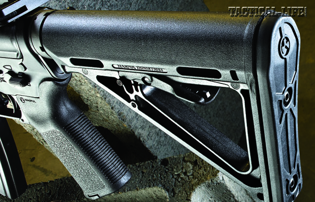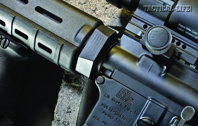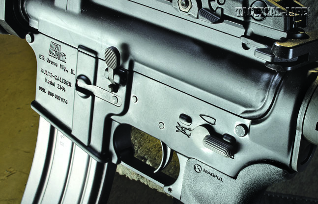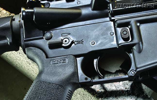 Completing the lower receiver is a Magpul MOE pistol grip and Magpul’s six-position MOE stock—both excellent choices—along with DSA’s ambidextrous safety selector switch. The mil-spec, single-stage trigger weighed in at a usable 7.5 pounds with a crisp break. The Magpul MOE grip feels great but does not cover the gap between it and the standard triggerguard; you’ll need Ergo’s “Gapper” to fill it.
