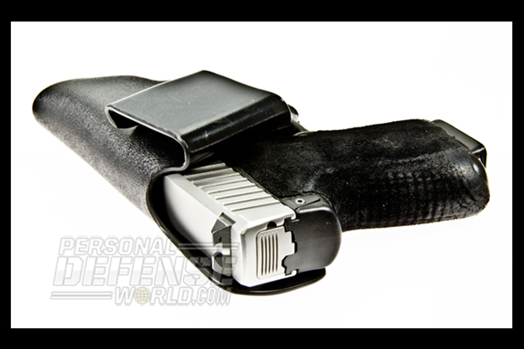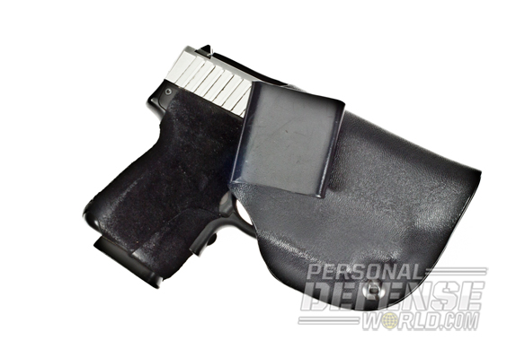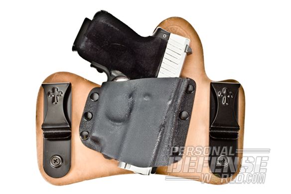 For standard inside-the-waistband (IWB) carry there are many popular options. PJ Holsters makes a fantastic line of Kydex holsters for many pistols and in several different configurations. The holster shown has slip-over clips that do not require you to thread your belt through to carry. This is a treat for people who need to slip the holster on and off multiple times a day. The holster is very thin and light compared to a leather holster. It provides great retention, is sweat proof and stays open while the pistol is drawn, allowing for easy re-holstering.