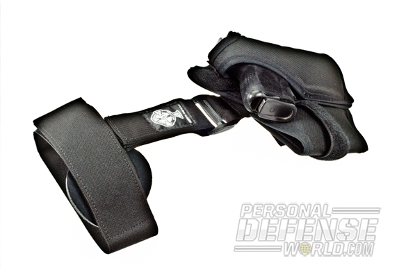 An ankle holster provides a carry method when no other carry method is feasible. The main requirements are that you have pants that are long enough to conceal the holster and that the grip of the gun isn’t long enough to create pant-leg fit issues. CrossBreed graciously supplied its small auto ankle holster for this task, and with it I carried a Kahr CM9 (Read the full review!) with no issues. The holster has an adjustable calf strap affixed with Velcro, which suspends the main holster via an adjustable Velcro strap. The main holster has another adjustable Velcro strap that wraps around the ankle. The holster itself is made of nylon and has Velcro thumb-break retention.