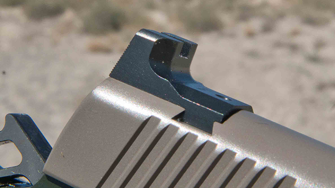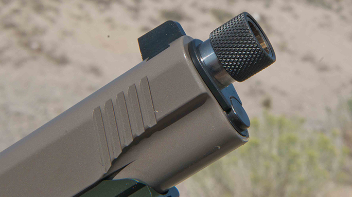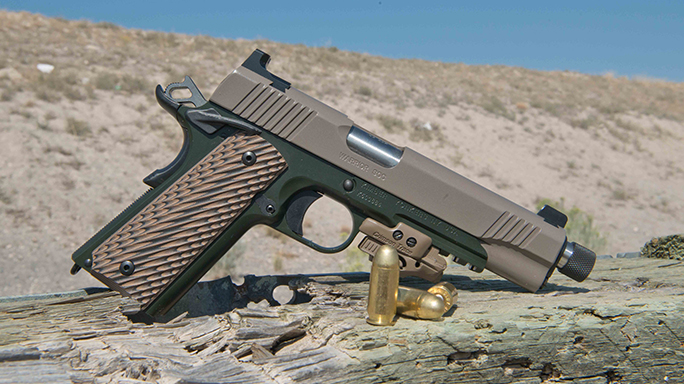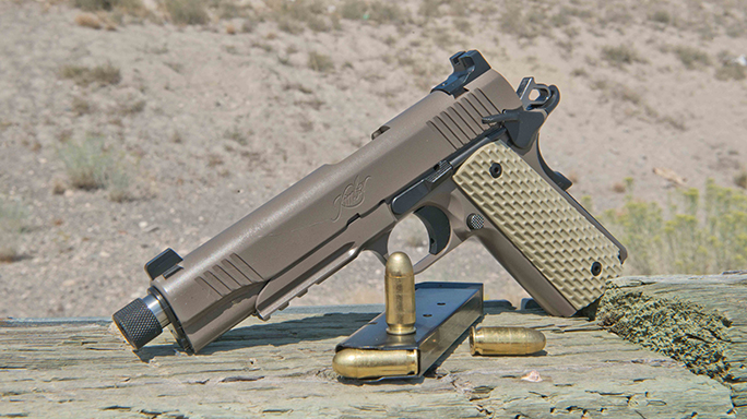 For testing, I recently got my hands on the Warrior SOC TFS, as well as Kimber’s Desert Warrior TFS. As their names suggest, both pistols come with threaded, 5.5-inch barrels. The Warrior SOC also comes with a desert tan Crimson Trace Rail Master red laser. Its frame is coated in dark green KimPro II, providing a nice look that contrasts the dark earth slide. G10 tactical grips in dark brown are also installed.