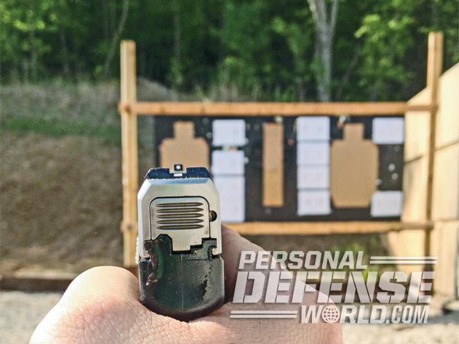 Surprisingly, the best accuracy returned with this pistol came from maintaining a grip no tighter than a gentle squeeze. Clamping my hands together, using the fingers to pull the palms together like a vise, actually degraded accuracy. Instead, the tiny pistol wants a firm grip that controls it, which means more energy is directed into cycling the slide than moving the firing hand, but no more than that. The comparably relaxed grip shrank groups at 10 yards by 20 percent and increased shooting pleasure.