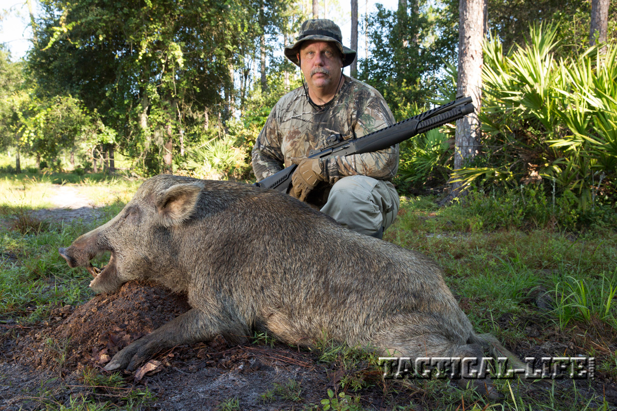 For this event, products focused on two weapon systems. One of ATI’s latest offerings, the Raven Stock Package, is a 922r compliance kit for the Benelli M4 shotgun. Chosen by the Marine Corps as their primary shotgun, the M4 is one of the most popular semi-auto shotguns on the market. As an import, setting it up for optimum use has always been problematic. ATI has taken the guesswork out of that process, providing you with a collapsible stock, pistol grip, forend, five-round magazine tube and railed extension, magazine follower, integrated heatshield and end cap. The end result is a fully 922r-compliant M4 with a collapsible stock, an adjustable cheekpiece, a comfortable forend, a mag extension tube and a rail for attaching any necessary lights or lasers. There are a ton of features to this system, and as a long-time Benelli M4 user, I can say that the add-ons are all well built, well thought out and increase the usability of the shotgun considerably. For targeting, our shotguns had either an Aimpoint CompM4 or Micro H-1 sight. My shotgun was equipped with the Micro H-1, and for hog work, we loaded up with Federal Vital-Shok TruBall Deep Penetrator slugs.
