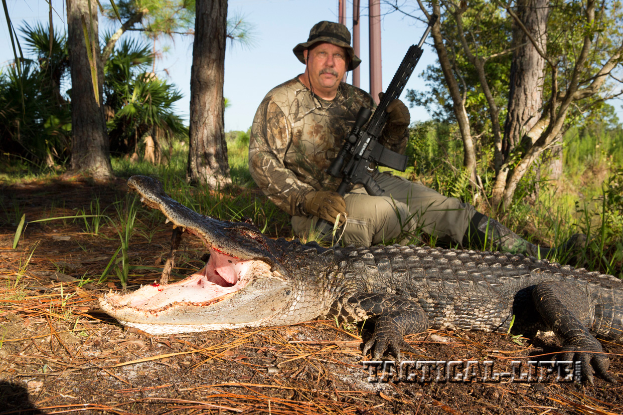Locally, most hunting is dedicated to coyotes. Tracking these creatures is challenging and requires some effort, making the light weight of an AR incredibly practical. The rest of my hunting experience has been mostly taking down hogs in Texas and Florida. I’ve used ARs in various calibers and barrel lengths for this purpose, and the platform really shines when hunting these animals. When Advanced Technology International (ATI) invited me to a writers’ event in Florida that included an opportunity to hunt alligators, I couldn’t resist.