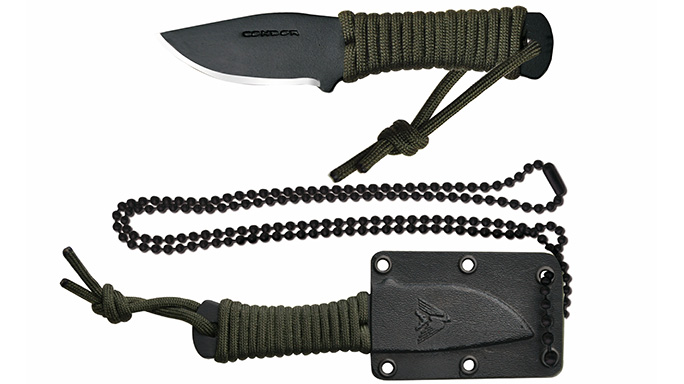Neck knives are one of the more obvious means of ensuring you have a cutting tool when the balloon goes up. Condor Tool & Knife recently added an interesting example of this category to its lineup called the Fidelis. The 1075 carbon steel, 2-3/16-inch-long, clip-point blade is mounted on a cord-wrapped handle and is carried in a Kydex sleeve with a neck chain. (condortk.com)