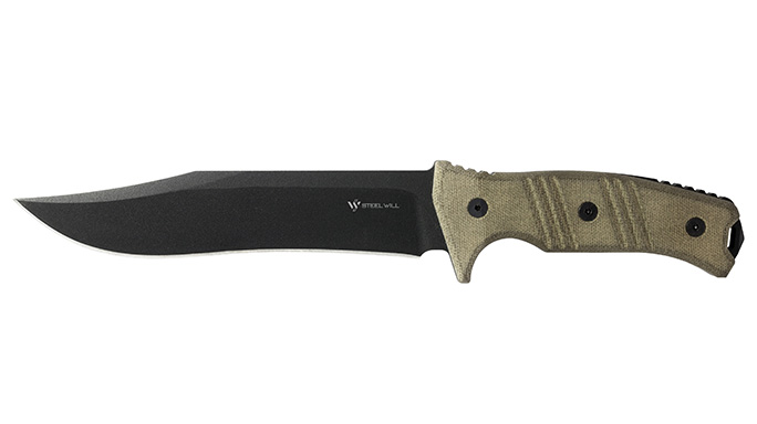 The full-tang construction forms a multi-purpose hammer/glass-breaker, and the Micarta handle is available in orange (1610) and green (1620). The Chieftain securely stores in a nylon sheath that is simple to clean and adapts to packs or belts. (steelwillknives.com)