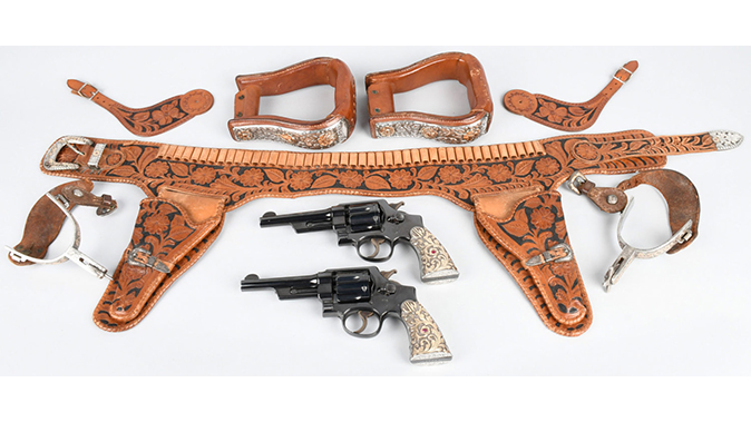 And yes, John Wayne’s two matching Smith & Wesson revolvers are up for auction. The description says these wheelguns have five-inch barrels and chiseled silver and gold grips with inset rubies. The grips have the initials “JW” at the top. The lot also includes The Duke’s hand tooled leather double holster, a pair of silver spurs with gold floral overlay and a pair of leather stirrups with silver and gold floral panels.