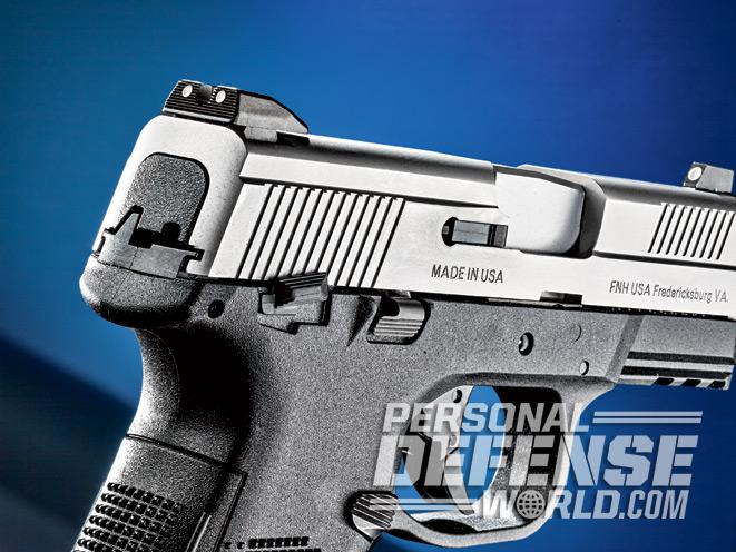 Excellent in handling and performance, FNS pistols bring more than a pre-loaded striker mechanism and the attendant short, light, reproducible trigger pull to the table. They bring an outstanding package of ergonomics and features. Part of that is the truly ambidextrous nature of the FNS pistol family—manual safety lever, magazine release and low-profile slide release. Only the takedown lever is one-sided (left), which no one could consider a problem. Already trim slide levers are enclosed on three sides by integral fencing.