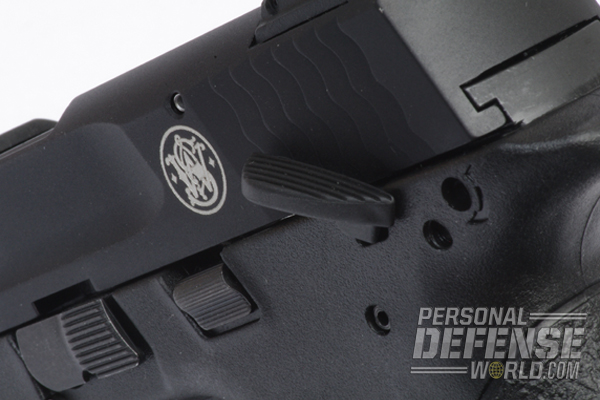 First and foremost, the M&P22 Compact is a hammer-fired single action rather than a double-action-only, striker-fired system like the standard M&P semi-auto. The trigger pull on my test pistol measured in at a 5.5 pounds. As a result of the pistol being a single action, it comes standard with an ambidextrous safety (as is available as an option on the standard centerfire pistol). The safety is located at the rear of the frame, and operates much like that of a 1911’s. In addition to the manual safety and the trigger safety, the pistol features a magazine safety, a trigger-activated firing pin block and an internal lock for manually locking the action of the pistol.