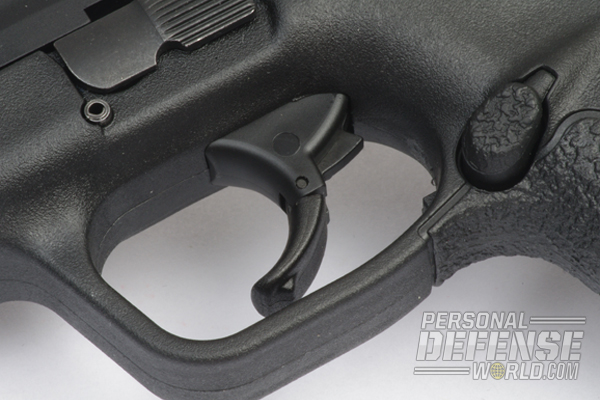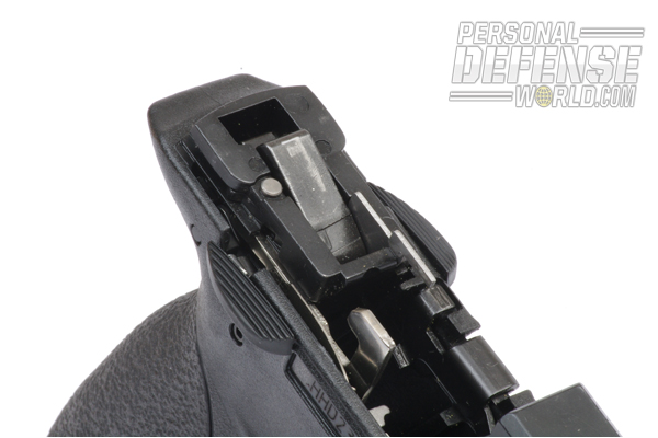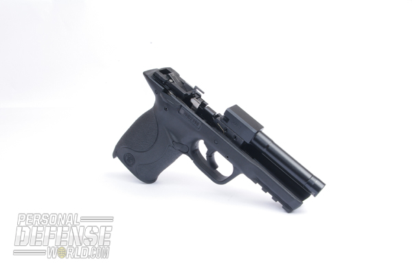 From a handling standpoint, the new pistol operates exactly as does a standard M&P semi-auto. Anyone familiar with the operation of the regular M&P will be right at home with the M&P22 Compact. The pistol features the hinged trigger that helps prevent unintentional discharges by requiring the trigger to be pressed for it to fire. The magazine catch is reversible, and the grip angle is the same as the full-size models. It is from a mechanical standpoint that the differences between the designs manifest themselves.