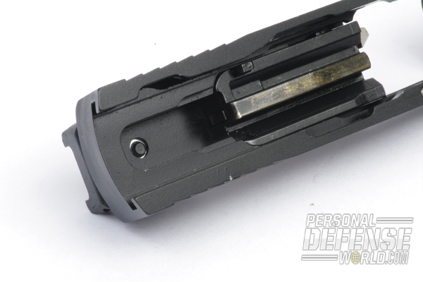 As you would guess, the pistol is a straight-blowback design due to its chambering, relying on a combination of slide mass and spring pressure to keep the action closed long enough for chamber pressures to drop to safe levels before cycling. The barrel (which features a threaded section covered by a cap) is fixed to the frame, and a captured recoil guide rod/spring assembly is located beneath it. Disassembly also differs from the standard pistol: You simply lock the slide back, rotate the takedown lever and then pull back the slide, lifting it up and over to remove. The frame does not feature interchangeable backstrap panels, and the aluminum alloy slide is topped off with adjustable sights.