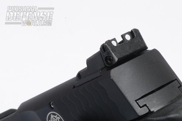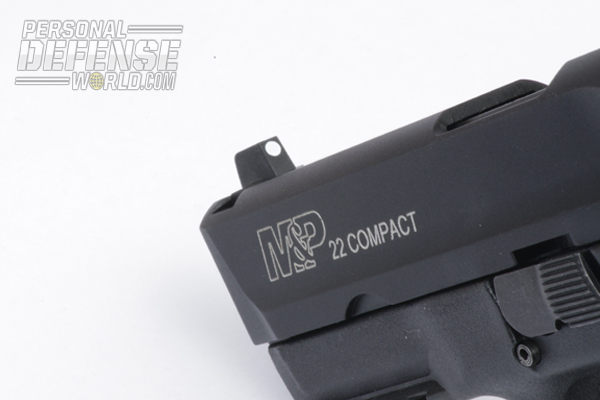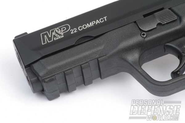 The pistol itself is unique. Rather than being a 1-to-1 scale version of the full-size pistol, the new M&P22 Compact is sized down to an 87.5-percent scale of the 9mm/.40 M&P series. The result is a pistol that visually appears to be the same as the standard but is more svelte and compact in the hand. In fact, the only thing that is not to the 87.5-percent scale on the pistol is (for obvious reasons) the strip of Picatinny rail on the dust cover.