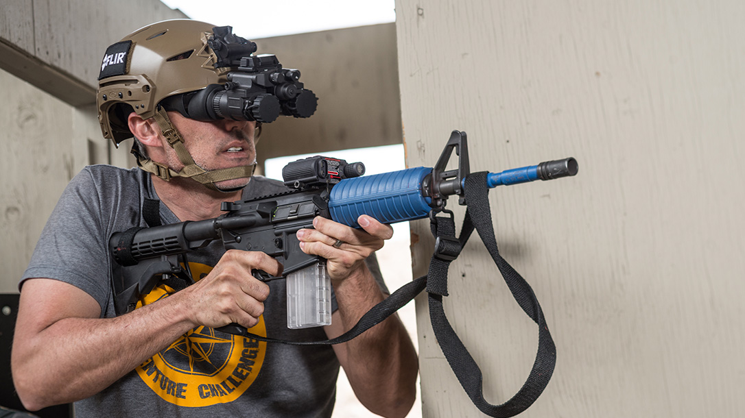 Over the following day and a half, we moved through more drills: Simunitions in the shoothouse with Armasight (part of FLIR) BNVD-51 night-vision goggles, steel drills and a gully hunt simulation with the Ruger carbines, and long-range shooting at night with the Ruger Precision Rifles.