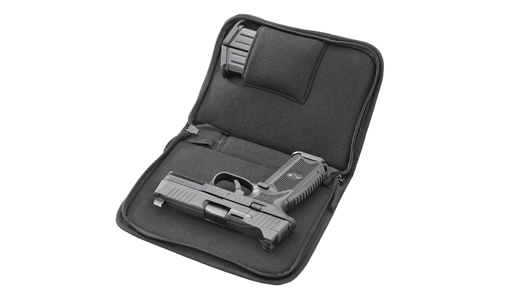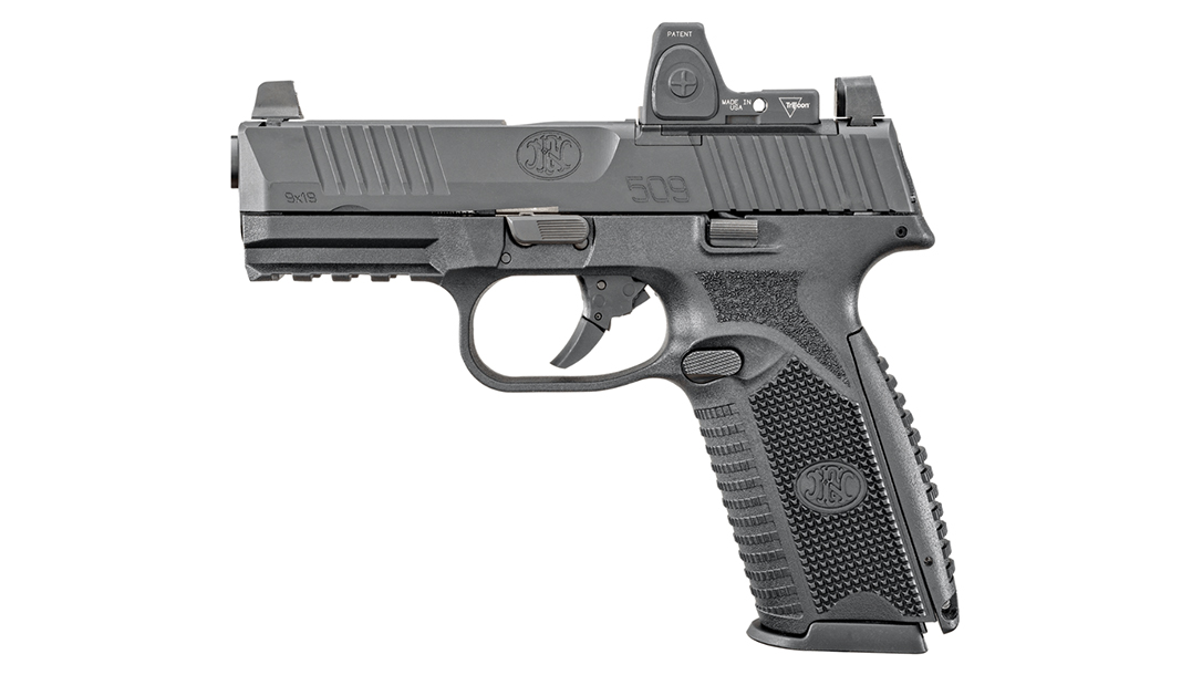Better still, the optics-mounting system accepts the majority of miniature red dots on the market. Moreover, the system enables a low-profile mount, co-witnesses with iron sights. Additionally, the slide does not require any milling to accept the optic. Also, a slide cap, for use when not shooting with an optic, features raised sight wings to protect iron sight alignment during hard use. A textured ramp aids when racking the slide against a belt loop, pant pocket or boot, according to FN.